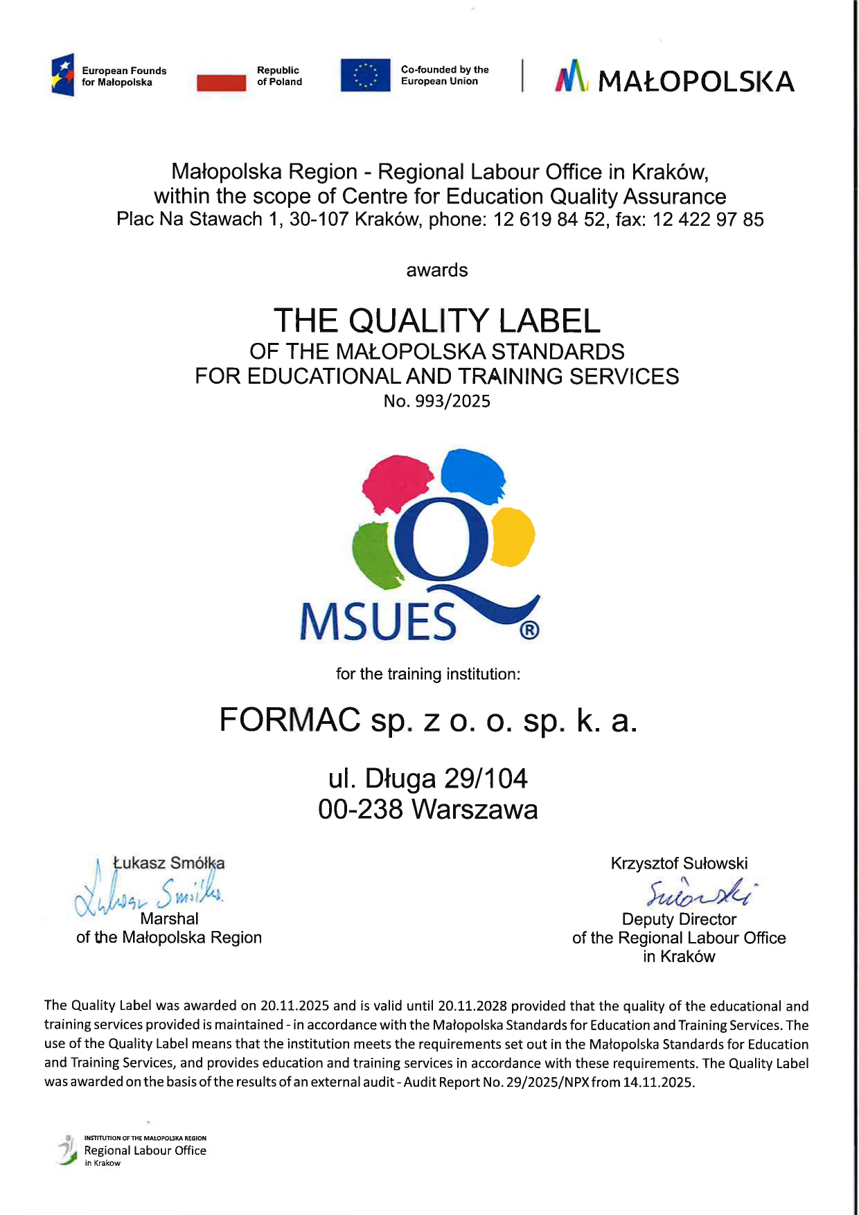 We are pleased to announce that FORMAC Sp. z o.o. Sp. k. has been awarded the Quality Label of the Małopolska Standards for Educational and Training Services.