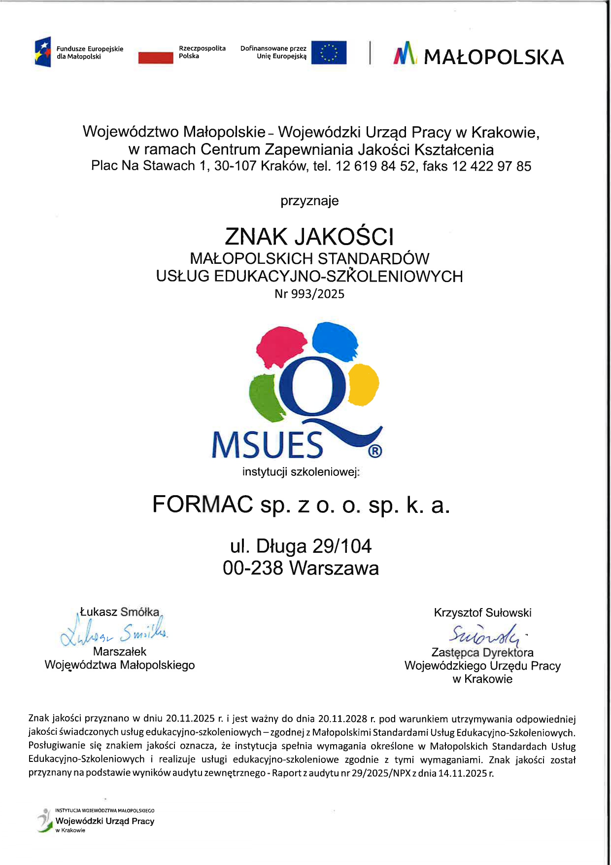 Z satysfakcją komunikujemy, że FORMAC Sp. z o.o. Sp. k. uzyskała Znak Jakości Małopolskich Standardów Usług Edukacyjno-Szkoleniowych.